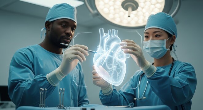 Medical Professionals Collaborating with Futuristic AI Holographic Heart in Advanced Operating Room