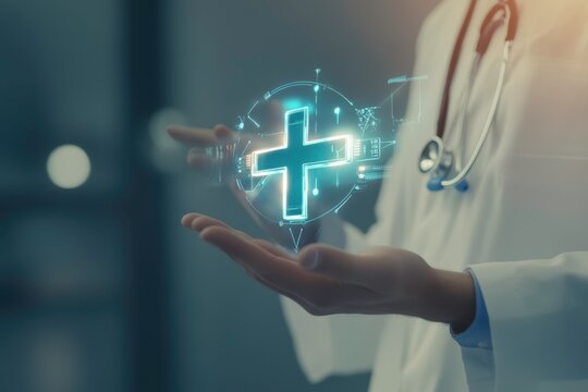 The image shows a doctor in a white coat holding a glowing medical symbol in their hand. The futuristic design represents digital healthcare, medical innovation, and advanced technology in medicine.
