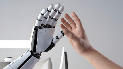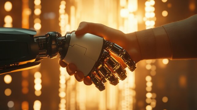 A symbolic handshake between a human and a robotic hand, representing the collaboration between artificial intelligence and humanity.