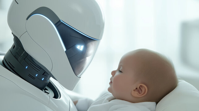 A futuristic robot with glowing features gently interacting with a baby, symbolizing the harmony between humanity and advanced artificial intelligence.