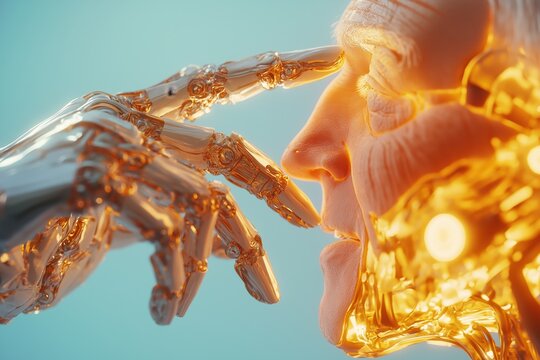 A human finger and a robot finger are poised to touch, symbolizing the interaction between human and artificial intelligence.