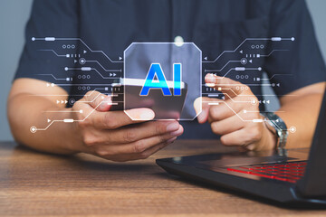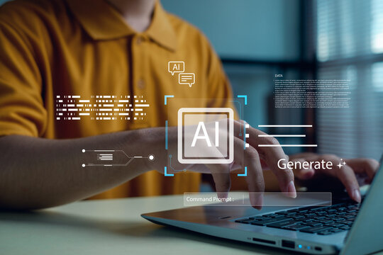 Artificial intelligence concept showing person typing on laptop with AI interface and generate command. Perfect for illustrating generative AI technology, data processing,machine learning innovation.