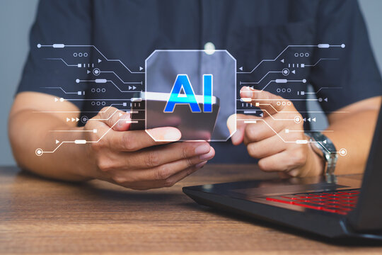 Futuristic AI interface concept with human hands holding phone surrounded by digital network graphics.