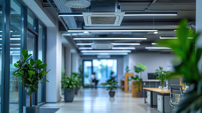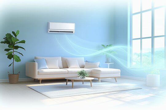 The air conditioner with blue effect in the modern living room feels refreshing and cool