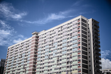 A tall residential building with pastel panels, red brick vertical section, air conditioners, and laundry hanging from windows under a clear sky.