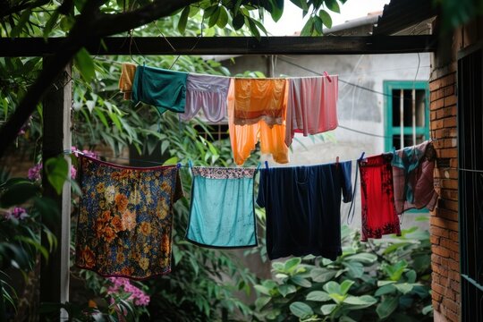 Laundry hanging outside on a clothesline next to a brick wall in an urban area during a sunny day