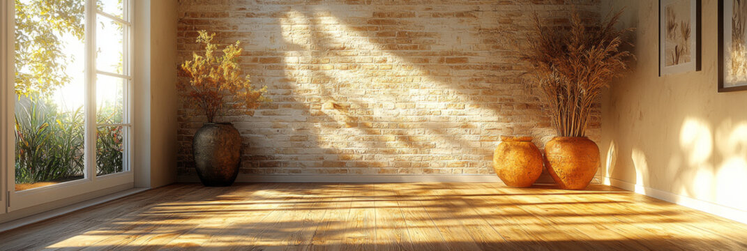 Sunbeams stream through a window in a room with a brick wall, hardwood floor, and dried plants in terracotta pots.