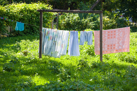Lingerie dries on a rope outdoors in the village