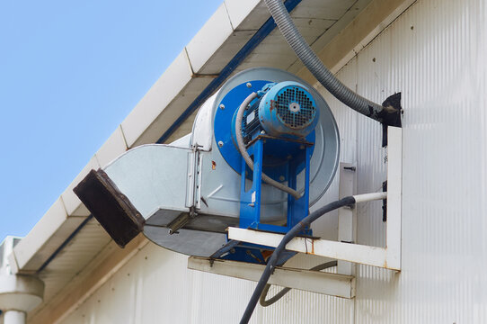 Dirty air extraction system. Equipment installed outside the building for exhaust and air filtration. Electric motor with an air pipe on the wall of the building. Selective focus