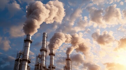 Industrial smokestacks release pollution into the sky at sunset, highlighting environmental concerns and climate change.