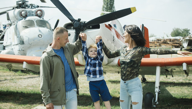 Happy family spend time together, on excursion, helicopter or plane on background, sunny day. Mother and father and their child walking in aviation museum outdoors. Development and upbringing concept.