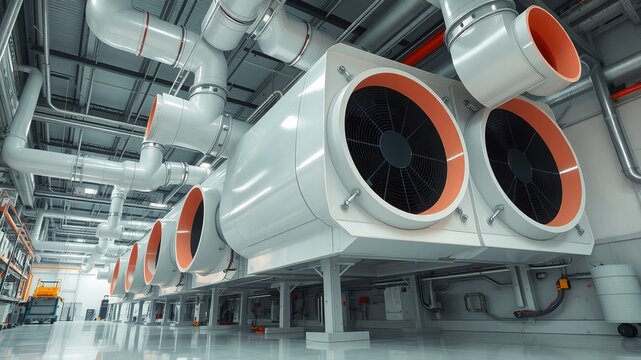 Large industrial air handling unit with ductwork and ventilation system installed in a spacious factory or warehouse providing climate control for efficiency.