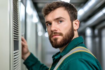 A young male engineer in a blue hard hat inspecting an air conditioning unit in an industrial setting.