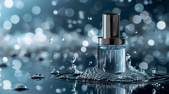 A sleek skincare serum product showcased with air bubbles on a reflective water surface.