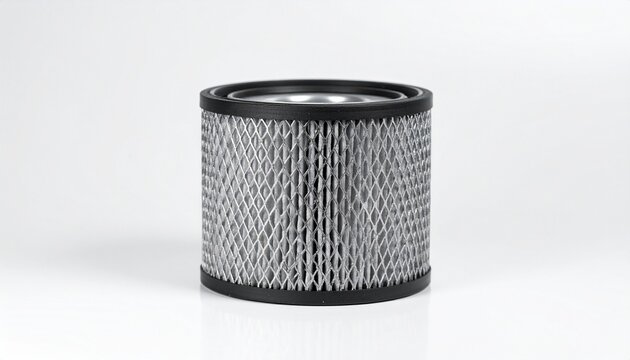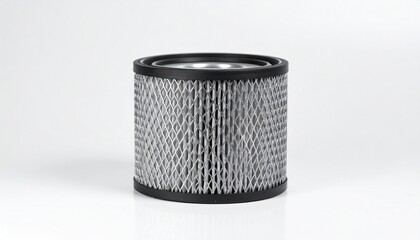 Cylindrical air filter with diamond-pattern metal mesh and black end caps, isolated on white background.