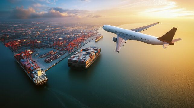 Airplanes fly over warehouses and ports, representing the logistics system in air transport, using advanced systems to improve efficiency in air cargo delivery.