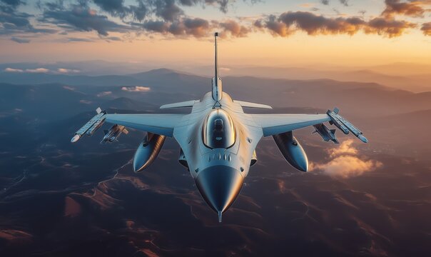 Fighter jet soaring above mountains during sunset with dramatic clouds