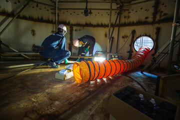 Male worker inspection vacuum test bottom plate tank with the area confined space blower air