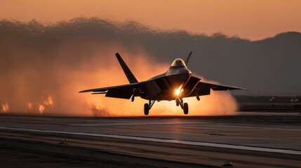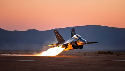 stealth fighter jet taking off from desert airbase at dusk with glowing afterburners