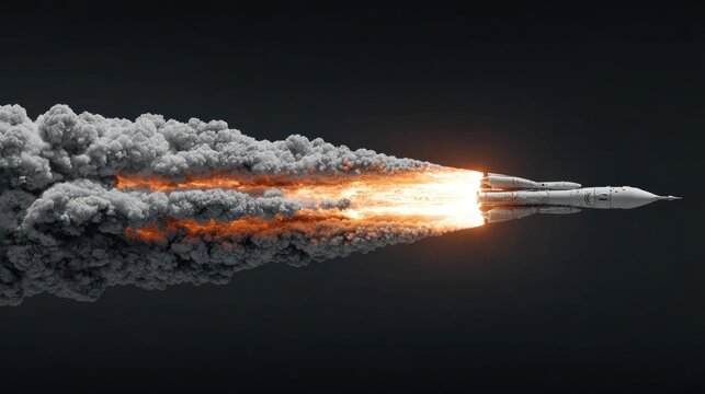 A rocket taking off with a trail of smoke, soaring against a light backdrop