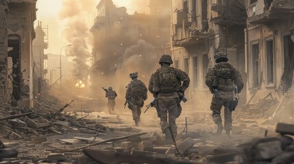 A group of Armed forces maneuvering forward amidst ruins of a war zone, surrounded by rubble and destroyed buildings. back view.