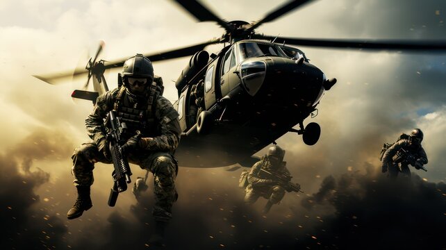 Airborne assault team parachuting into enemy territory at night. Covert operation, military, special forces.
