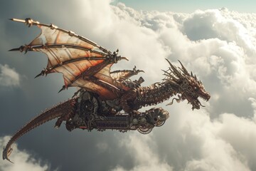 Steampunk dragon flies through cloudy skies, a fantastical and mechanical marvel of airborne wonder.
