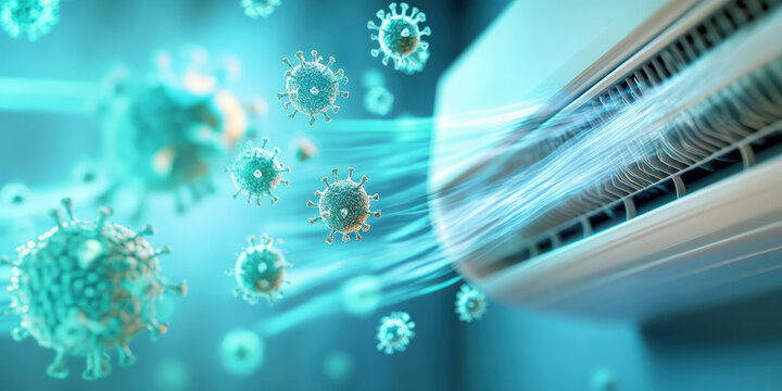 A UV-lit image reveals an air conditioner emitting hidden microbes and spores, making invisible threats visible and highlighting potential air quality risks.