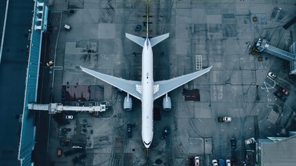 An aerial view of a commercial airplane parked at a gate at an airport. The aircraft is surrounded by ground support equipment and luggage carts.