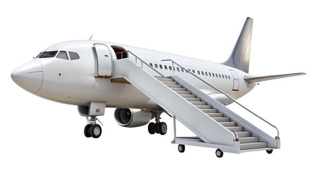 Wide body passenger airplane with a boarding stairs at the airport apron in the evening sun