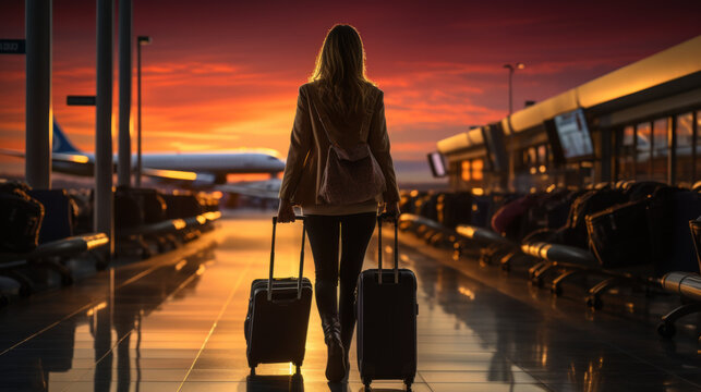 Travel and technology. Pretty young woman using smartphone waiting for boarding in airport terminal.