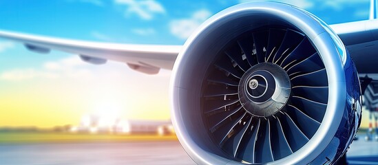 Turbo engine of a plane awaiting takeoff at an airport copy space image