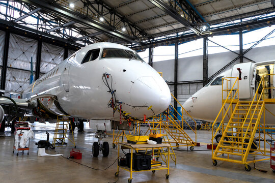 Aircraft is in the hangar for technical repair and maintenance. Aircraft diagnostics, storage, service. Plane. Ladders for mechanics