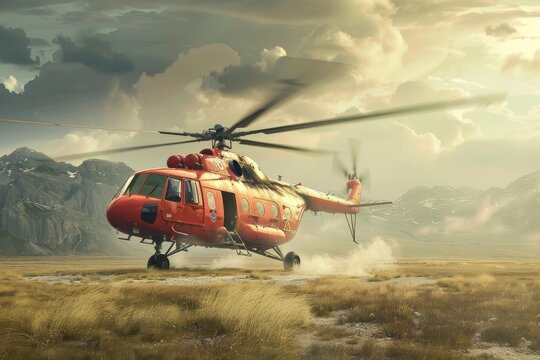 A red and white medical helicopter flies through the sky with a bright, blue sky and white clouds in the background. Generative AI