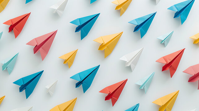 small minimalistic paper planes in different colors evenly distributed on white background