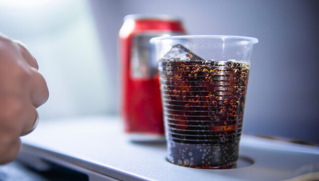 A glass of soda next to a can of the beverage, on the onboard service tray of the airplane, attended by flight attendants