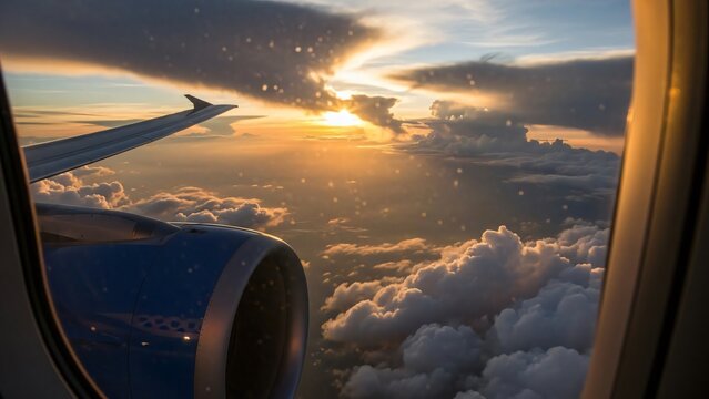 Experience breathtaking aerial view of vibrant sunset over clouds from airplane window seat today