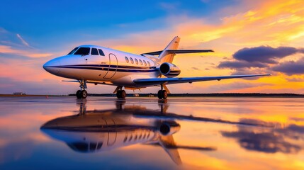Private jet parked on a runway at sunset, reflecting vibrant colors in the wet surface, serene atmosphere
