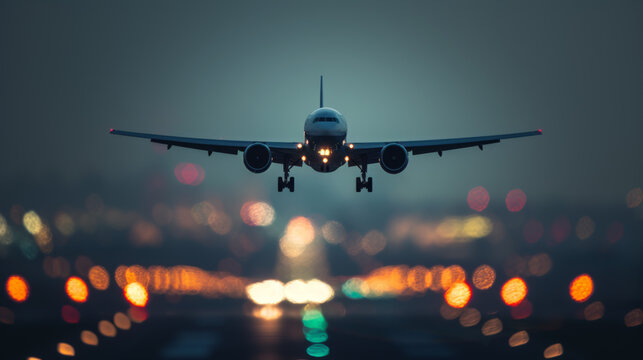 Avion de ligne biréacteur vue de face juste avant son atterrissage
