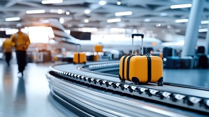 conveyor belt in airport concept. Baggage carousel at an airport with yellow suitcase and staff in the background.