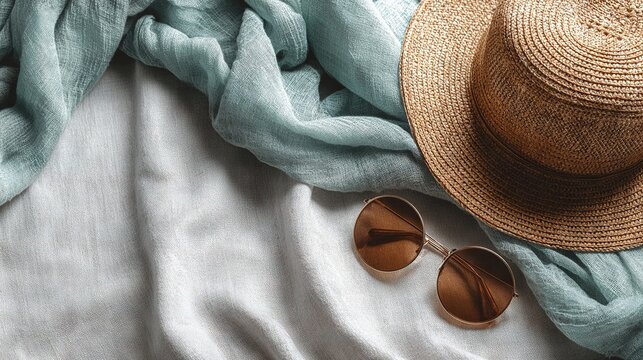 Straw hat, round sunglasses, and soft aqua scarf arranged on light fabric, evoking relaxed summer vacation mood with coastal elegance and style
