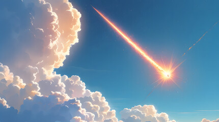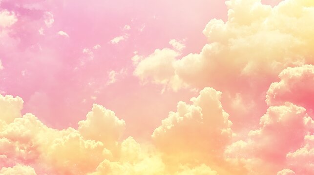 Bright sunlight rays illuminate the beautiful pink and blue sky, with fluffy white clouds creating an abstract and dreamy atmosphere