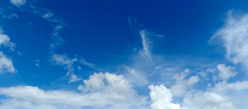 bright blue sky with fluffy clouds, peaceful cloudscape horizon