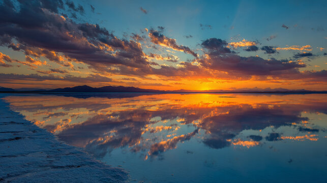 Glowing salt flats reflecting sunset light like a mirror.