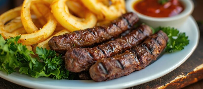 Cevapcici served with fries and onion rings.
