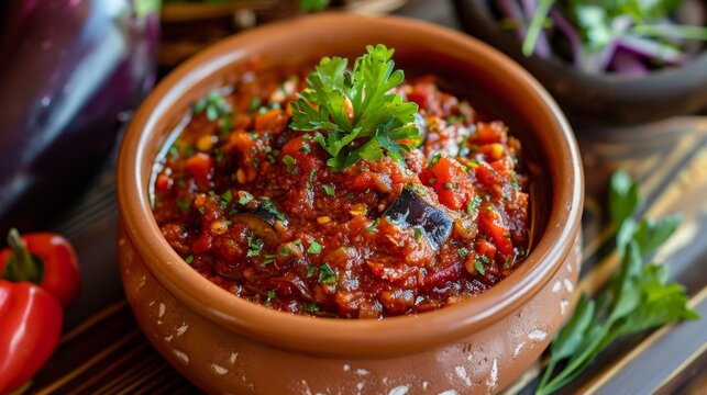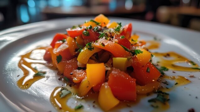 Savory Aivar Appetizer with Colorful Sautéed Bell Peppers, Garlic, and Fresh Herbs Drizzled with Olive Oil on a White Plate
