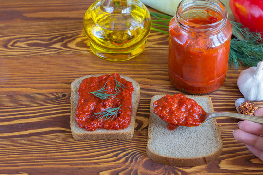 The woman's hand superimposes an aivar on bread against the background of inradients for its preparation.