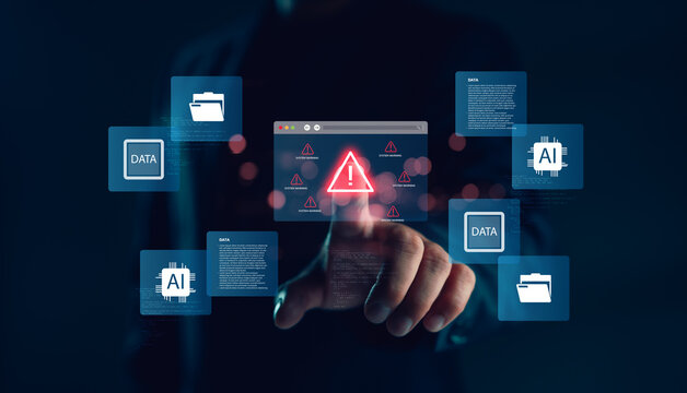 Cybersecurity concept with AI and big data icons, showing system warning alert for data breach risk, protecting digital information and artificial intelligence systems from cyber threats.