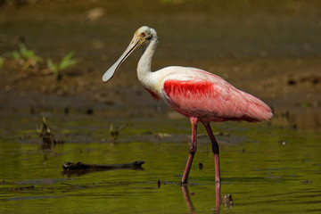 Roseate Spoonbill wading in a shallow lagoon. Platalea ajaja