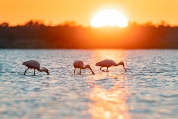 Roseate spoonbills (Platalea ajaja) using their spoon-shaped beaks to forage for food in the shallow water of Upper Lake Myakka in Florida.